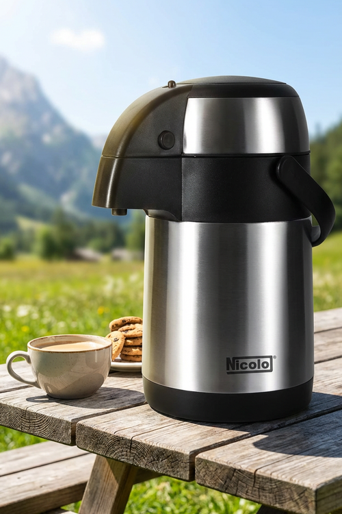 فلاسک استیل ۲.۵ لیتری پمپی نیکولو (Nicolo) انتخابی ایدهآل برای نگهداری حجم بالای نوشیدنیهای گرم و سرد در مهمانیها، محل کار، جلسات و استفادههای پرمصرف است. ظرفیت ۲.۵ لیتری این فلاسک باعث میشود بدون نیاز به پر کردن مداوم، نوشیدنی همیشه در دسترس باشد.